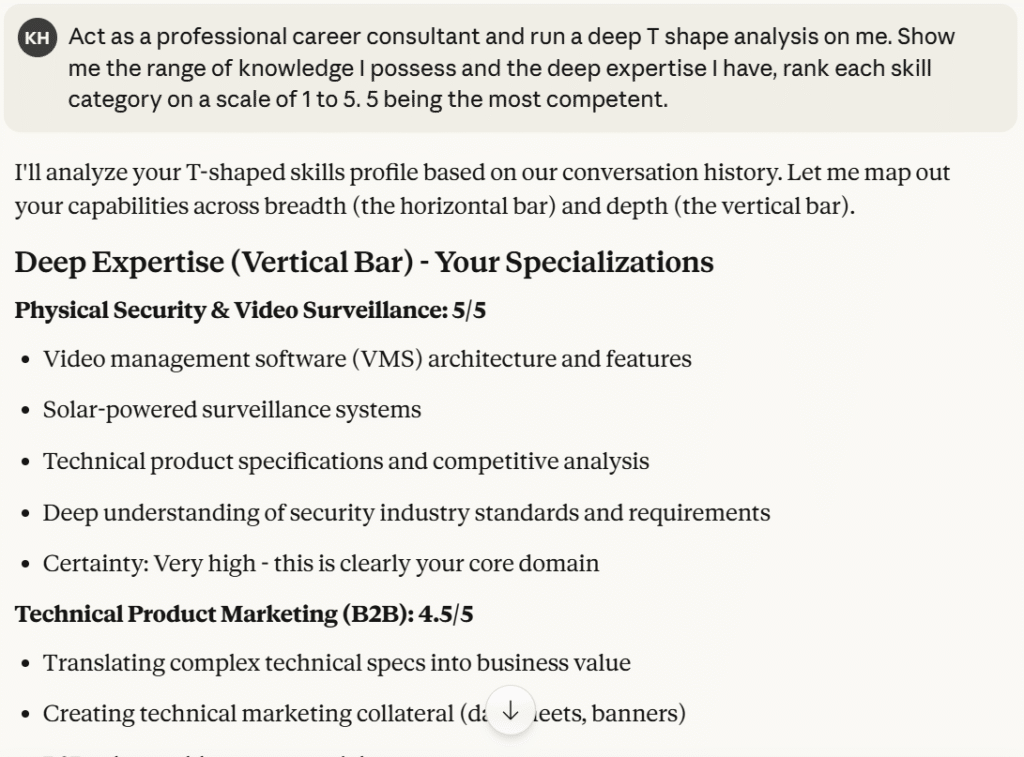 Act as a professional career consultant and run a deep T shape analysis on me. Show me the range of knowledge I possess and the deep expertise I have, rank each skill category on a scale of 1 to 5. 5 being the most competent.